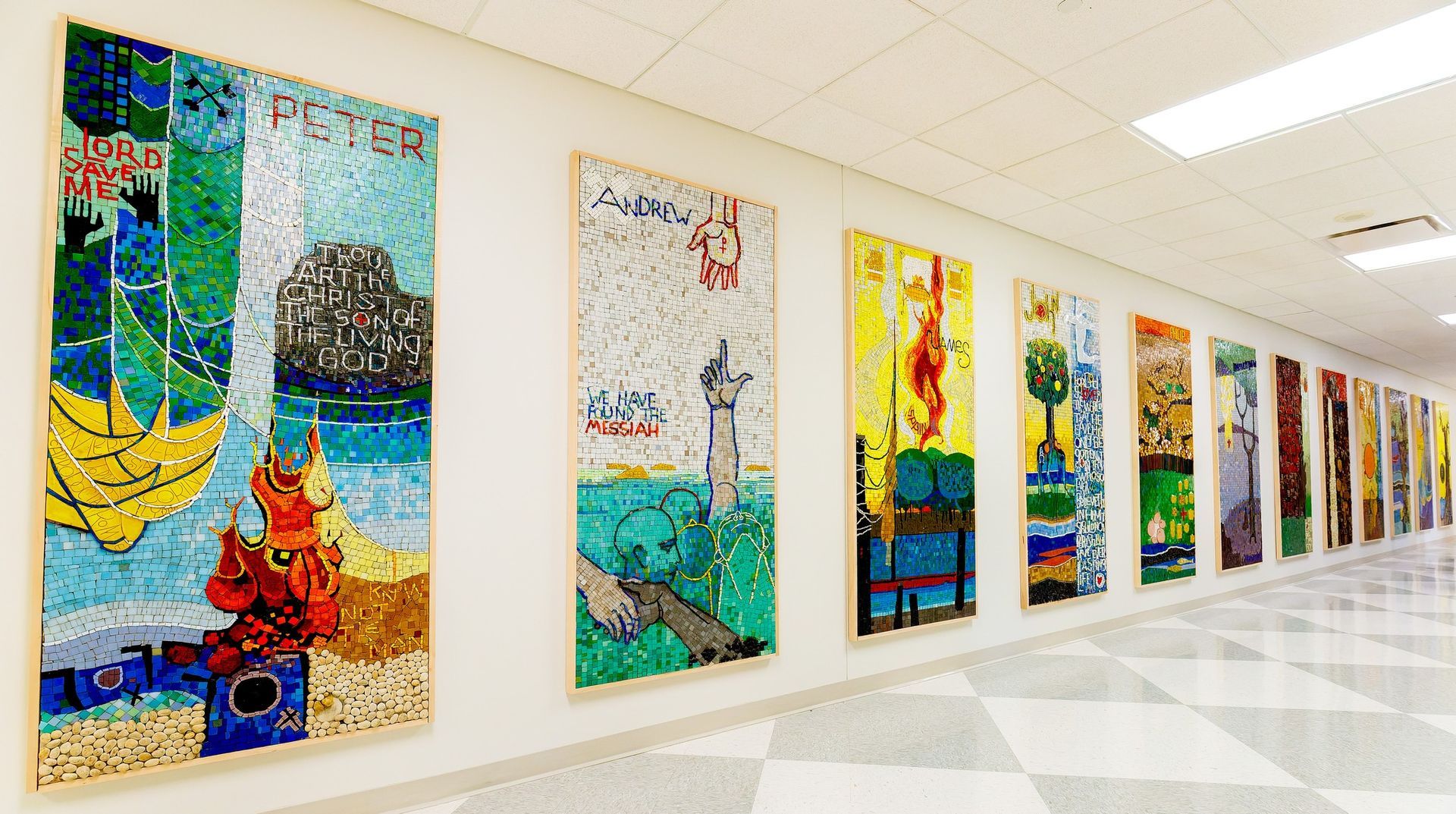 In 2014 the St. John school officially closed its doors leaving the mosaics isolated from public viewing due to the disuse of the classrooms. In 2023 St. John was looking for a "new home" for the mosaics which would allow for public viewing. Concordia University, Seward Nebraska, the home of the original creator (Marxhausen) accepted this donation. Mr. Michael Sheer supervised the restoration and location for the panels. Currently, they are displayed in a long hallway on the third floor in the Thom Building on the campus of CUNE. Each panel has a story to tell as the gospel message is portrayed through the various symbols, bible references, church traditions and of course, very unique art materials. This collection is the only one of its kind. And it's very impressive to view the mosaics as a group on one long wall.